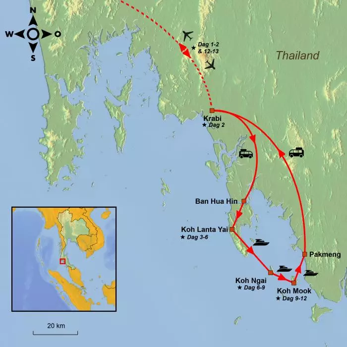 Under resans gång kommer du att bo på Koh Lanta, Koh Ngai och Koh Mook – tre mycket olika öar och alla med sin egen charm. Här väntar fina vita sandstränder, vackra fascinerande utsikter, höga lodrätta berg, små lokala samhällen samt snabba speedboats och traditionella motorbåtar som tar dig från den ena ön till den andra.