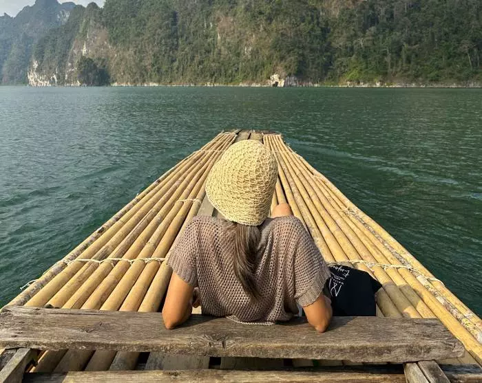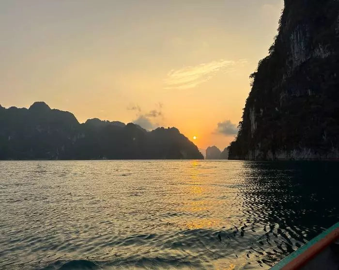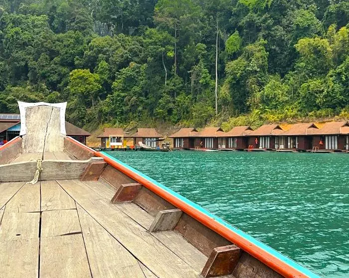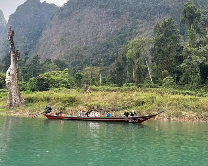 Sedan körs du till Ratchaprapa-piren, tätt inpå den imponerande dammen. Här kliver du ombord på en traditionell träbåt och seglar ut på Cheow Lan-sjön, där du kan njuta av det majestätiska landskapet med de ikoniska kalkstensklipporna.