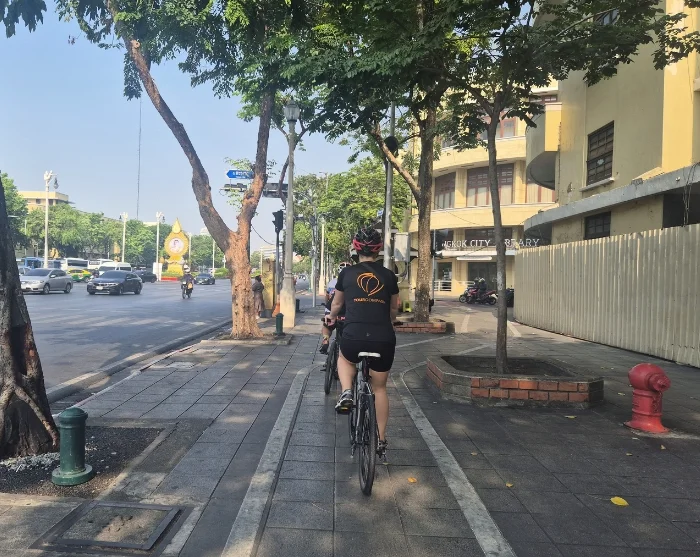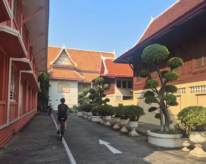 Efter en kort genomgång och anpassning av cykeln ger du dig av tillsammans med en duktig och erfaren cykelguide. Vägen är enkel och platt, så de flesta kan delta. Du cyklar genom det populära backpackerområdet, Khaosan Road, och vidare genom små gränder och förbi små kanaler. Turen går vidare längs Chao Phraya-floden till Rama VIII-bron, där du korsar floden till västra och autentiska Bangkok. Här besöker du gamla tempel och upplever det lokala livet på nära håll. Sedan cyklar du vidare längs den stora kanalen Bangkok Noi, genom små, lugna gator och förbi en lokal by, där lokalborna glatt ler och vinkar åt dig. Du korsar en liten bro och över till den andra sidan av kanalen, där du passerar buddhistiska tempel och Thonburis järnvägsstation. Härefter tar du färjan tillbaka till livliga östra Bangkok, där du cyklar förbi kungapalatset, Grand Palace. Du ställer ifrån dig cykeln och tar en promenad i den fina närliggande parken, Saranrom, som en gång i tiden endast användes av den kungliga familjen. Sedan sätter du dig på cykeln igen och cyklar förbi en väldoftande matmarknad. Du ankommer till Sao Ching Cha (Giant Swing), vilket är utflyktens sista stopp och ett av Bangkoks populära landmärken.
