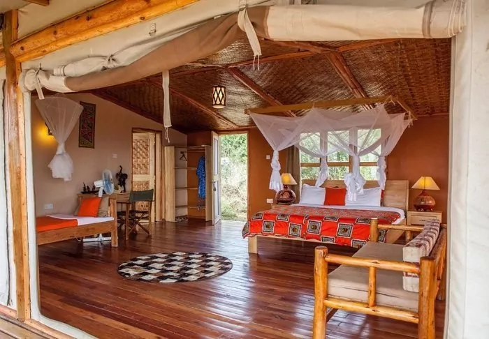 Lodgen består av både stugor och tält, alla charmigt inredda och utrustade med eget badrum och veranda. Endast lokala material har använts, och allt är byggt av lokala hantverkare, vilket gynnar de lokala samhällena i området.