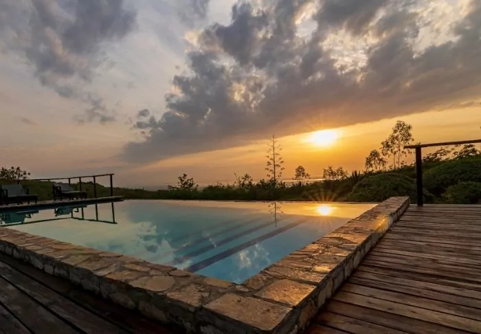 Poolen är byggd på en träplattform i anslutning till gräsmattan och erbjuder både solstolar och utsikt. På kvällen tänds brasan, och med en lokal öl i handen kan dagens safariberättelser delas.