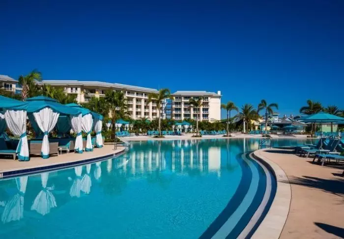Oceans Edge Resort & Marina är byggt i en vacker karibisk stil, ett utseende som kännetecknar hela resorten, både på in- och utsidan. De vita trähusen ger en vacker kontrast mot de gröna oaserna, och här finns så många som sex uppvärmda saltvattenpooler. Medan du ligger i vattnet och känner lugnet komma kan du njuta av ljudet av vajande palmer och vågor som slår mot båtarna i marinan i bakgrunden.