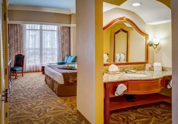 Resorten har något för alla, både par och familjer. Loews Sapphire Falls Resort ligger bredvid en bred sjö, och man får vacker utsikt över vattnet från hotellets små oaser och poolområdet. Du kan koppla av vid den stora poolen, som är designad som en tropisk oas med palmer och en liten strand. Om du reser med barn, kommer de utan tvekan att älska vattenrutschbanan och en tur till lekrummet. Du kan också mysa framför brasan medan du gör en S’more – den välkända amerikanska desserten som består av rostade marshmallows, kex och choklad.
