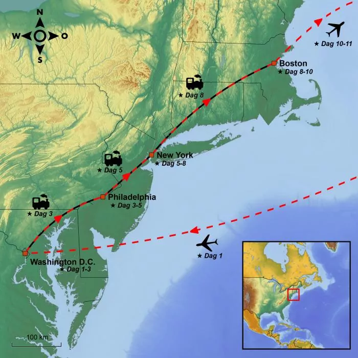Följ med oss på en spännande tågresa som tar dig genom några av de viktigaste platserna i världshistorien – historiskt, politiskt och kulturellt. Detta är en enkel tågresa, där du stannar till mitt i fyra olika städer på den amerikanska östkusten: Washington D.C., Philadelphia, New York City och Boston.