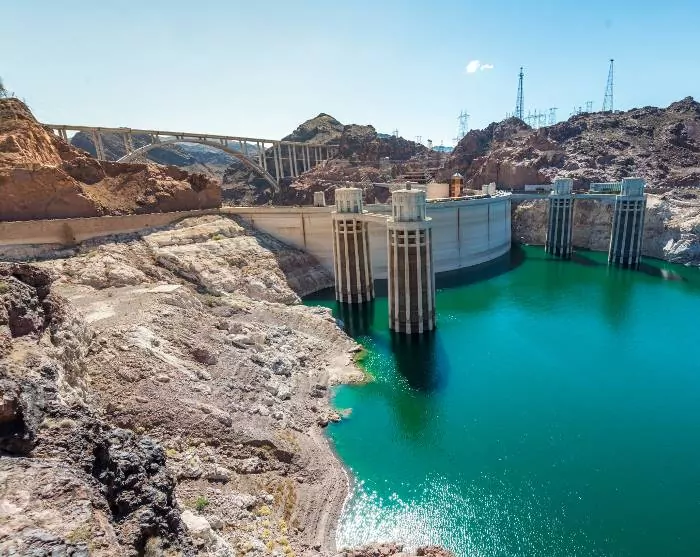 När det återstår cirka 45 minuters bilresa till Las Vegas bör du göra en avstickare till den enorma Hoover Dam. Dammen, som skär igenom Coloradofloden, är en imponerande konstruktion med en höjd på hela 221 meter och en längd på 379 meter. Den ligger precis på gränsen mellan de två staterna Arizona och Nevada, vars tidsskillnad på 1 timme illustreras av en enorm klocka på platsen.
