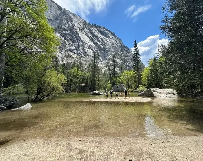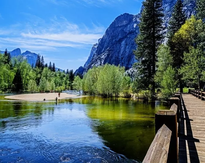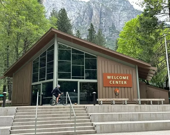 I Yosemite Valley finns det även möjlighet att hyra en cykel, och du kan använda de asfalterade cykelvägarna för att cykla från ett vattenfall till nästa, medan du njuter av utsikten över de enorma klippväggarna och träden runt dig. Ett bra ställe att njuta av ett mellanmål är vid den lilla sandsträckan vid Swinging Bridge Picnic Area, där du har utsikt över vattenfallet Yosemite Falls.