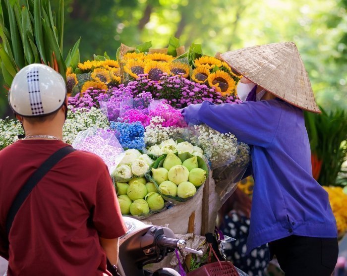 Du fortsätter ner längs gatan Hoang Hoa Tham, vilket är en livfull gata full med blomsterbutiker och lokala handlare. Njut av de förtrollande dofterna från säsongens blommor och åsynen av de fina små bonsaiträden.