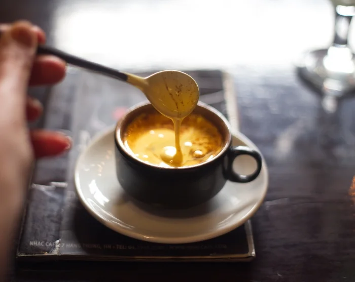 Du tar dig själv till startplatsen, Hidden Gem Café, ett undangömt och hållbart café där du får en kort introduktion och ser hur det ikoniska vietnamesiska äggkaffet tillagas.