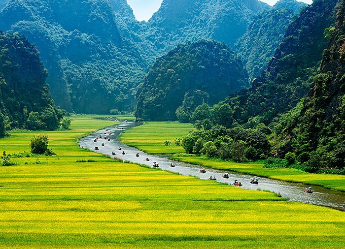 I närliggande Trang An går du ombord på en sampan – en liten flatbottnad träbåt. Luta dig tillbaka och njut av den 2,5 timmar långa båtturen medan du stilla guppar fram på floden genom pittoreska landskap bland böljande risfält och grönklädda kalkstensklippor, som skjuter upp i landskapet. Landskapen står med på UNESCOS världsarvslista och kallas Ha Long-bukten på land. Längs vägen åker du genom flera grottor och kan njuta av det rika fågellivet. På land igen går resan tillbaka till Hanoi.