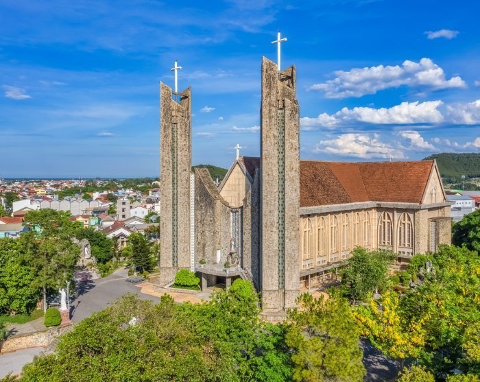 Turen fortsätter till Phu Cam-katedralen, en betydelsefull katolsk kyrka, känd för sin imponerande arkitektur som kombinerar modern design med traditionella element. Byggd på en höjd med utsikt över Hué, reser sig Phu Cam-katedralen med en storslagen fasad med två höga torn som sträcker sig mot himlen. Katedralen är en central samlingspunkt för det katolska samfundet i Hué och står som en viktig symbol för den kristna närvaron i regionen.