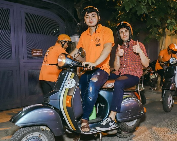 Du hämtas på hotellet av din guide, och en Vespa-förare kommer att stå klar för att visa dig Ho Chi Minh-staden efter mörkrets inbrott. Efter att ha tagit på dig hjälmen hoppar du upp på skoterns passagerarsäte och sticker iväg – och med en gång blir du en del av stadens puls.