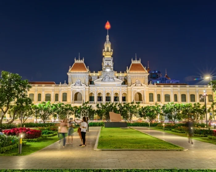 Vid skymningen kan du strosa nedför Nguyen Hue-promenaden, som omges av blommor, fontäner och stämningsfull arkitektur. Här möter du stadens kvällsliv, när lokalbefolkningen samlas tillsammans med gatukonstnärer, dansare och unga familjer i ett livligt myller. Atmosfären är både avkopplande och energisk — allt kulminerar kring det upplysta stadshuset.