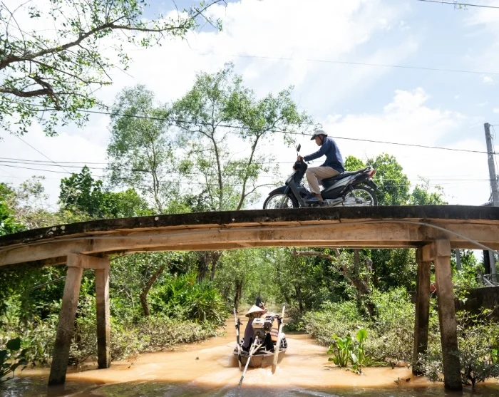 Resans sista del tar dig till Mekongdeltat, där du övernattar och färdas på de små kanalerna omgivna av vattenkokospalmer. Här besöker du vårt hållbara och sociala utvecklingsprojekt i Vinh Long, som initierats av vår lokala samarbetspartner och som du är med och stöttar – en procentandel av resans pris går nämligen direkt till det viktiga arbete som bedrivs här.