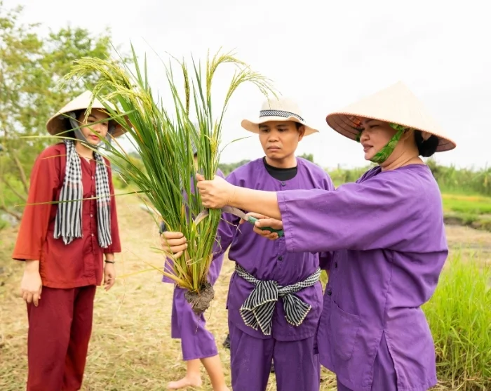Du fortsätter sedan till vårt sociala hållbarhetsprojekt i Vinh Long, som initierats av vår lokala samarbetspartner. Här väntar en lugn promenad genom byn, där din guide ger dig inblick i projektet längs vägen. Du får även chansen att prova på det traditionella lantbrukslivet. Tillsammans med lokala bönder får du prova på risodling – antingen genom att plantera späda risplantor eller genom att hjälpa till vid skörden, beroende på säsong. Det är en lärorik och jordnära upplevelse som ger dig en unik inblick i livet på den vietnamesiska landsbygden och det arbete som ligger bakom ett hållbart jordbruk. Genom att delta på denna tur bidrar du samtidigt till att göra skillnad för familjerna i Vinh Long, då en andel av priset på resan går direkt till projektet, som du kan läsa mer om här.
