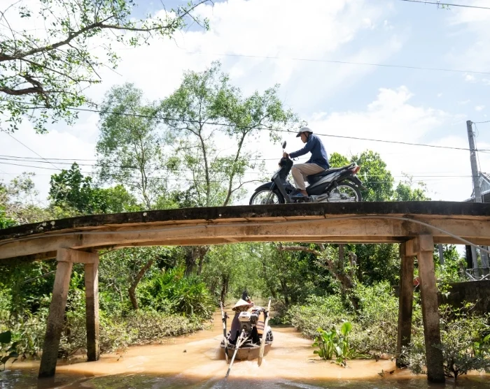 Så snart du lämnar Ho Chi Minh-staden märker du hur landskapet börjar förändras. Längs vägen passerar du gröna fält och mindre floder samt kanaler som slingrar sig genom det platta landskapet. Det är inte ovanligt att se lokala bönder arbeta på fälten medan vattenbufflar betar längs vägkanterna, och små stånd erbjuder färsk frukt längs vägen.