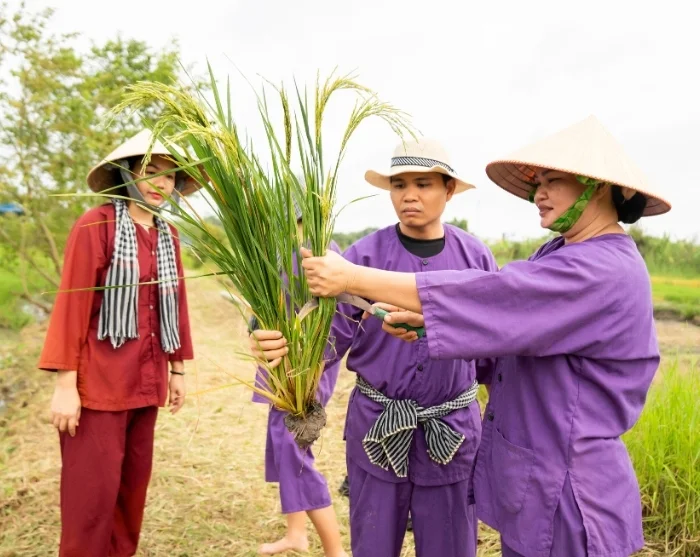 Du reser vidare till vårt sociala hållbarhetsprojekt i Vinh Long, som har startats av vår lokala samarbetspartner. En stillsam promenad genom byn väntar, där din guide under tiden ger dig inblick i projektets syfte. Du får också möjlighet att själv ta del av det traditionella lantbrukslivet. Tillsammans med lokala bönder kan du prova på risodling – antingen genom att plantera späda risplantor eller genom att hjälpa till vid skörden, beroende på säsong. Det är en lärorik och jordnära upplevelse som ger dig en unik inblick i vardagen på Vietnams landsbygd och i arbetet bakom ett hållbart jordbruk. När du deltar i utflykten bidrar du samtidigt till familjerna i Vinh Long, eftersom en del av resans pris går direkt till projektet, som du kan läsa mer om här.